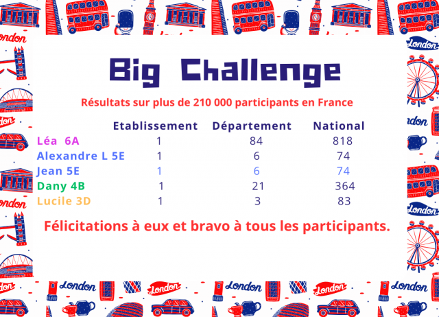 Cette année encore nos élèves ont été nombreux à participer au concours en anglais Big Challenge.
